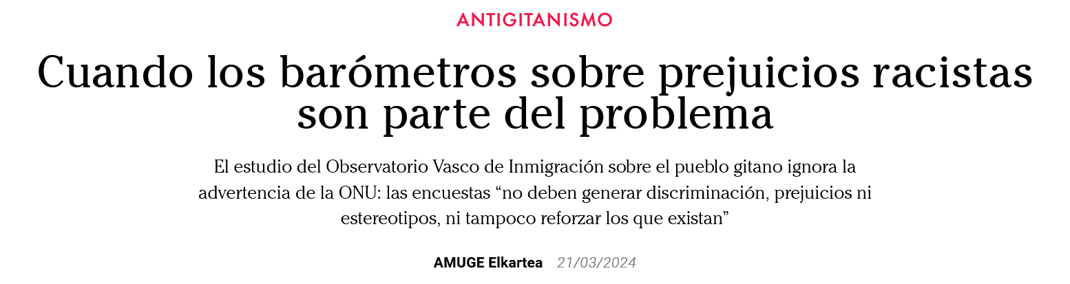 Un ejemplo es el Barómetro sobre percepciones y actitudes hacia la población extranjera, que el Observatorio Vasco de Inmigración, Ikuspegi, presentó en enero de 2023 el primero que realiza sobre el Pueblo Gitano.